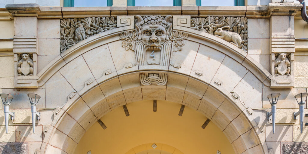 Portalerna som markerar ingången till jugendhusen var ofta rikt utsmyckade med växtslingor, blomrankor och organiska, mjuka former på tak, fasader, fönster och balkongräcken. Symboler från antiken hade varit vanliga långt tidigare som prydnad, men under jugendperioden valde svenska arkitekter att vända sig till vår egen natur för inspiration. Det var såklart inte bara arkitekterna som blickade ut i floran och faunan, under tidigt 1900-tal fanns en vurm för naturen i både konst och litteratur. Åren då huset på Södra Förstadsgatan 4 byggdes började Elsa Beskow bli känd för sina rikt illustrerade barnböcker med djur- och naturmotiv och inom konsten var Bruno Liljefors redan ett stort namn. Att ekorrar, älgar, harar, björnar och ugglor fick pryda husfasaderna – hörde helt enkelt till tiden. Men bara här i norr, i Italien, var jugendstilen helt inriktad på grönska och växtlighet, där kallas stilen ”Stile floreale – blomstersstilen”.