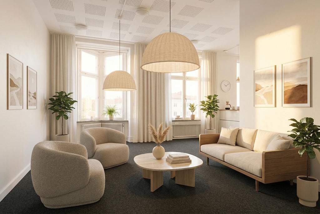 - Flexibel planlösning: Optimal mix av flera ljusa kontorsrum, två representativa mötesrum och stora sociala ytor.