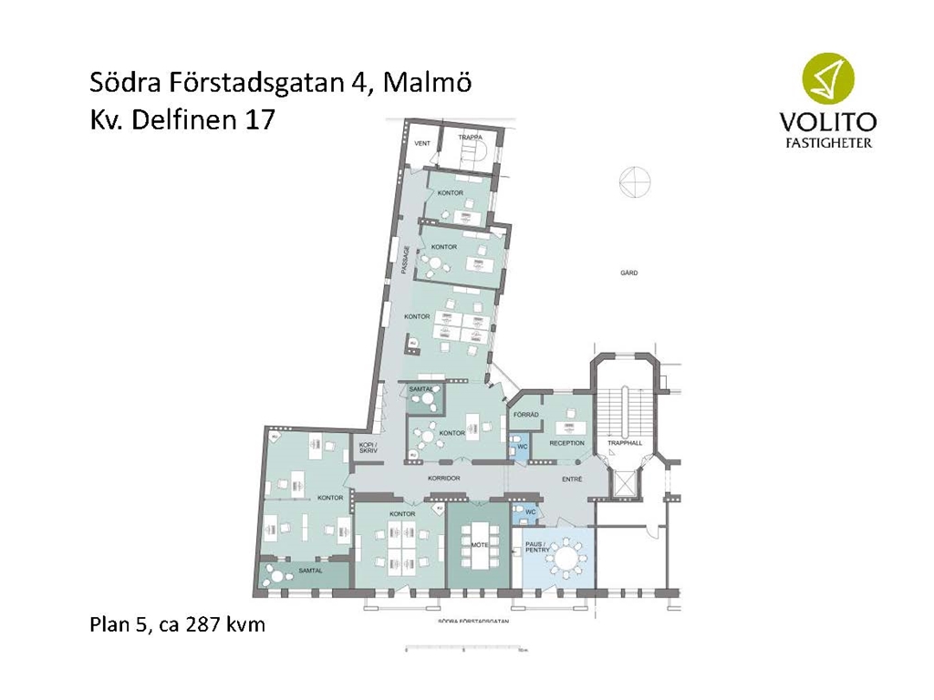 Nästan mitt på Malmös centrala gågata, några få steg från kanalen, ligger en av stadens vackraste byggnader, och tillika den första fastigheten Volito förvärvade. Byggnaden är ett praktverk i tidstypisk jugendstil med en ornamenterad fasad och en mängd välbevarade originaldetaljer, såväl exteriört som interiört. Fastigheten erbjuder ljusa och modernt utrustade kontor i varierande storlek och utformning, i en miljö som präglas av eleganta trapphus, stora ljusinsläpp, högt i tak, dekorativa stuckaturer, pampiga kakelugnar, takbjälkar, utsikt över cityliv och takåsar och inte minst en solig terrass på översta våningen.
